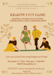 Wydarzenie odbędzie się w ramach Nocy Anglistów i będzie okazją do wspólnego odkrywania miasta poprzez aktywności oparte na mediacji, dialogu oraz budowaniu porozumienia. Gra inspirowana jest książką Deborah Jackson Taffy Whiskey Tender i została przygotowana z myślą o uhonorowaniu historii oraz perspektyw rdzennych społeczności.